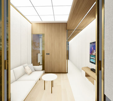 這是安一工研開發第一種住宅艙,具備2房1廳機能,全室配置恆溫恆濕空調系統,以遊艇內裝等級裝修,能夠在有限的空間內滿足小家庭居住需求。